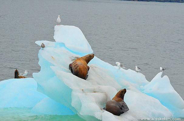 유빙 위에서 노니는 해달과 바다사자 그리고,