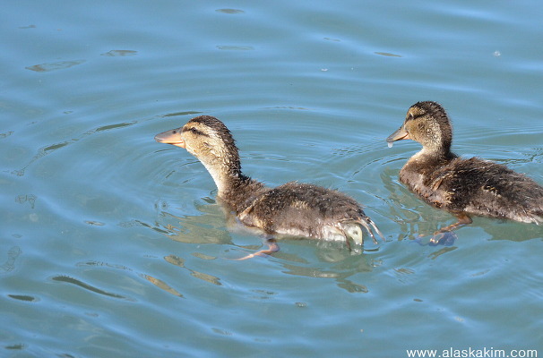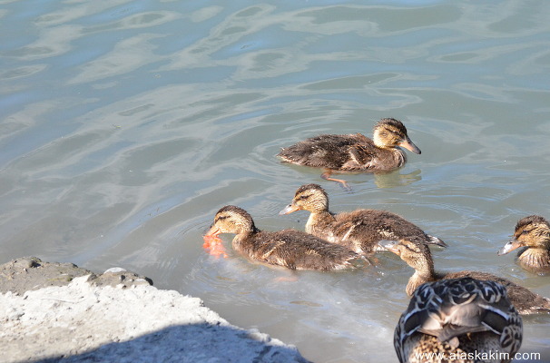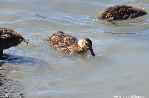 좌측에 연어알을 흘리자 청둥오리들이 서로 먹겠다고