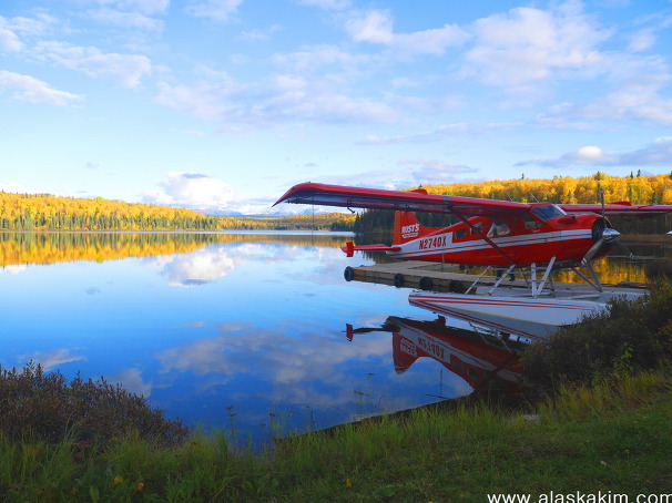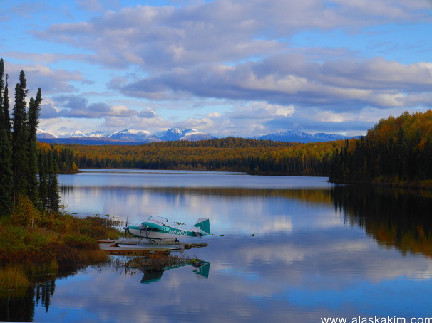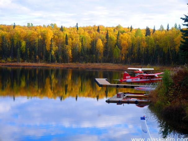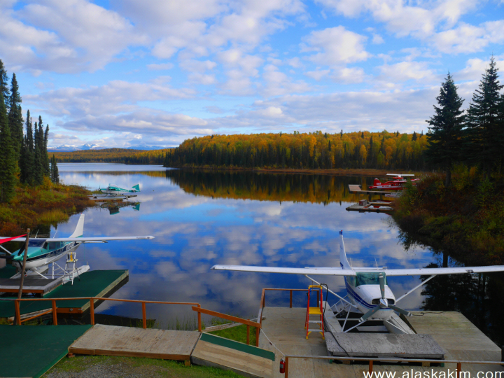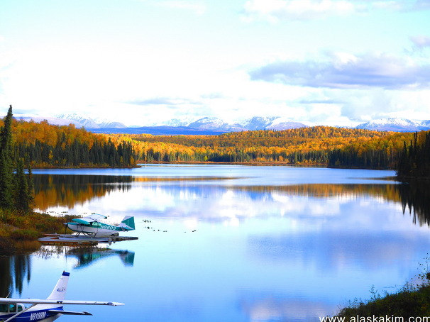 그 호수에는 디날리행 수상 경비행기들이 호수 위에서