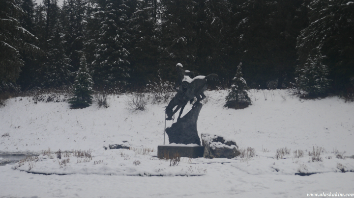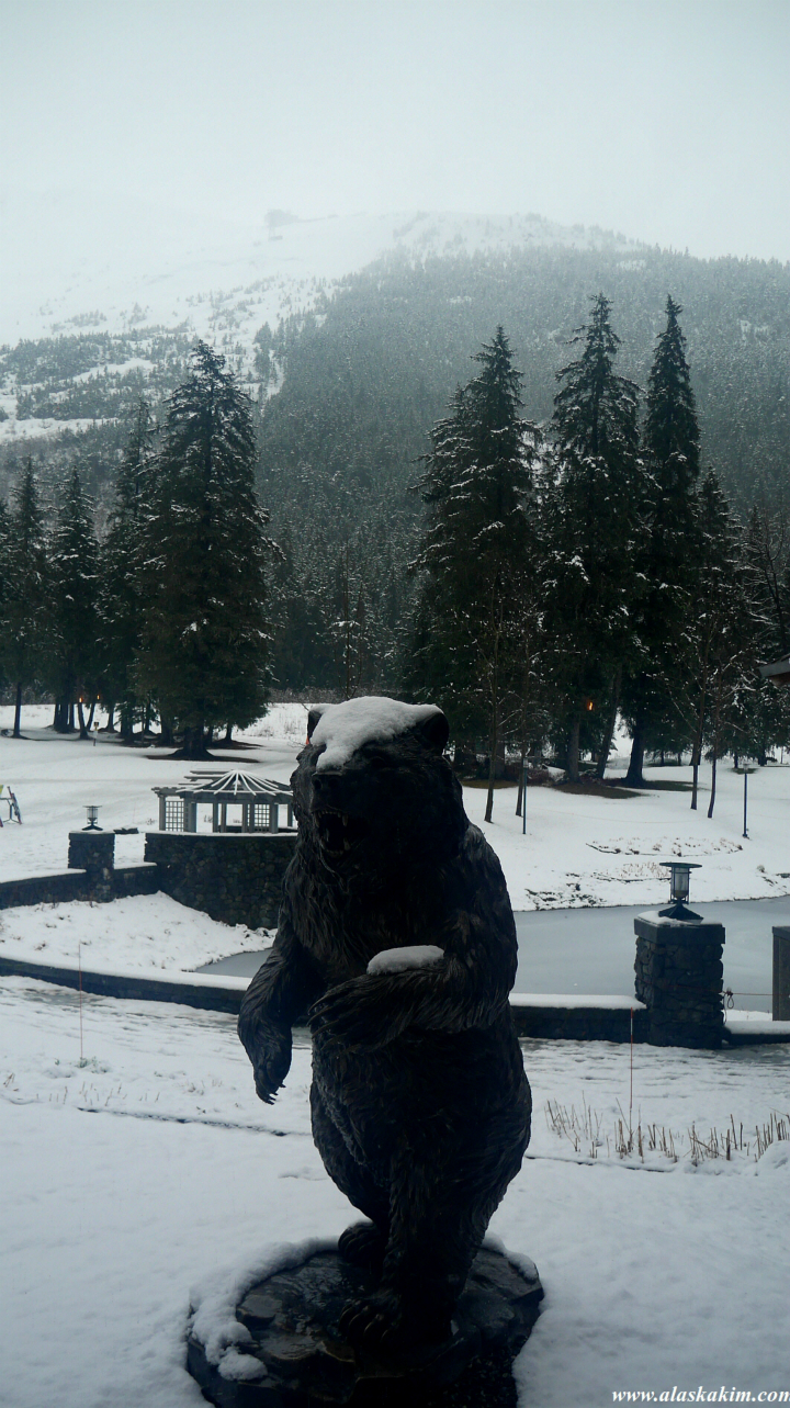 알래스카다운 조각상인데 식당 앞에서