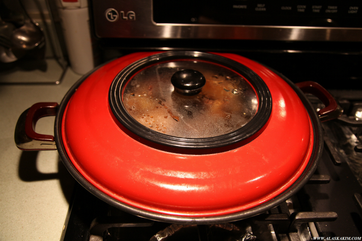 다양한 향료와 재료를 넣고 돼지고기를 삶는 중입니다.