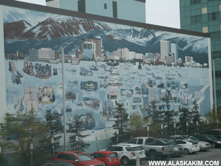 앵커리지 시내 지도가 건물 외벽에 모두 그려져 있습니다.