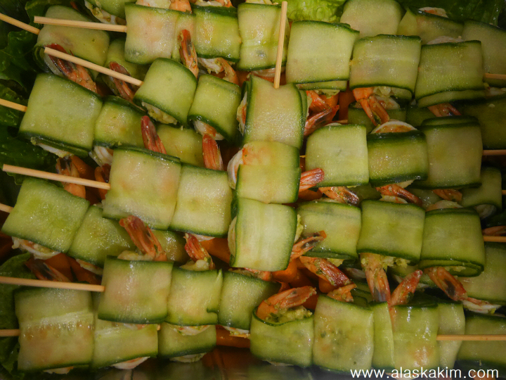 삶은 새우를 얇게 썬 오이로 옷을 입혔습니다.