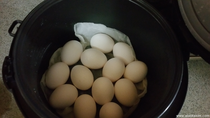 페이퍼 타월을 물에 적셔 밥솥에 깔고 , 그위에 계란을 가지런히