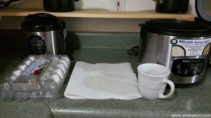 페이퍼 타월을 물에 적셔 밥솥에 깔고 , 그위에 계란을 가지런히