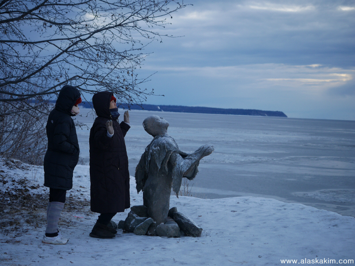 바닷가 조각상 앞에서 두 팔을 벌려 알래스카만의 향기를 받아들이고