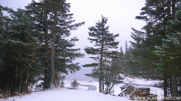 가문비나무 사이로 눈 내리는 바닷가가 얼굴을 내밉니다.