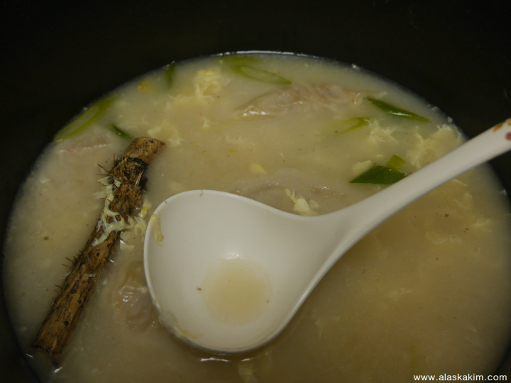 진한 사골에 가시오갈피를 넣고 끓여 잡 냄새를 잡아주었습니다.