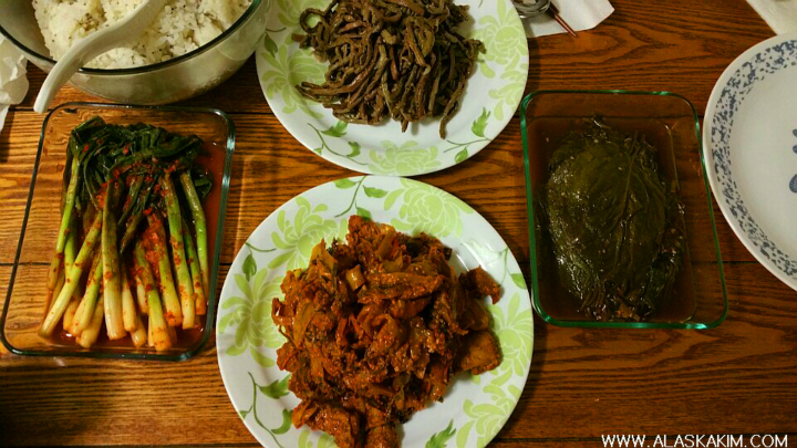 파김치와 고비, 그리고 텃밭에 자랐던 깻잎, 돼지불고기 볶음입니다.