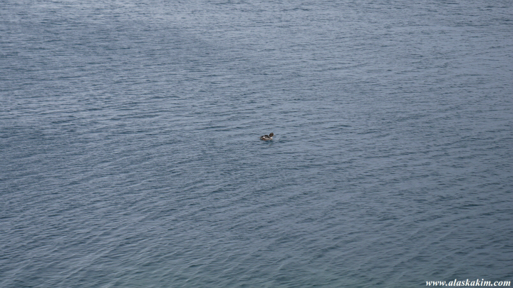 북극 오리 한 마리가 바다 한가운데 홀로 고독을 즐기네요.