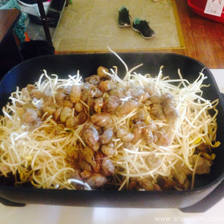 육수를 어느 정도 따라 버린 다음, 콩나물과 미더덕을 올려놓습니다.