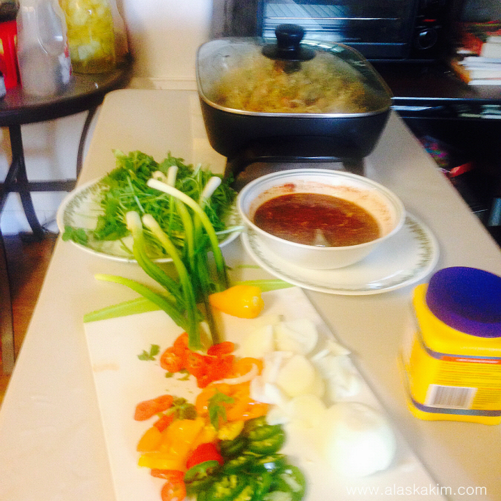 고추, 파, 양념장 (마늘 다진 것과 고추장, 고춧가루, 참기름 등) 양파 등을