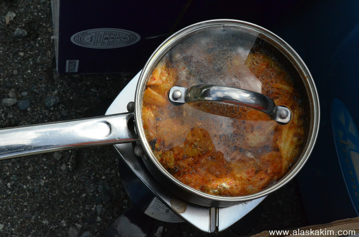 김치와 꽁치를 넣고 보글보글 끓이고 있는 중입니다.