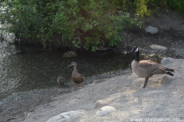 캐나다 기러기가 청둥오리를 근처도 못 오게 째려보고 있습니다.