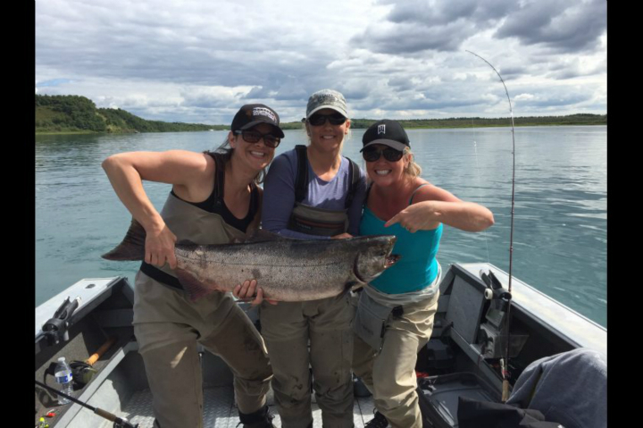 이글 리버 강가에서 세 처자들이 왕연어를 잡았습니다.