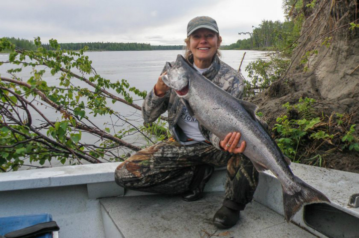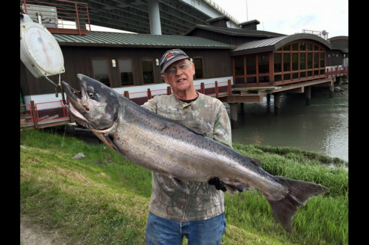 부부가 함께 33파운드 왕연어를 잡아 올렸네요.
