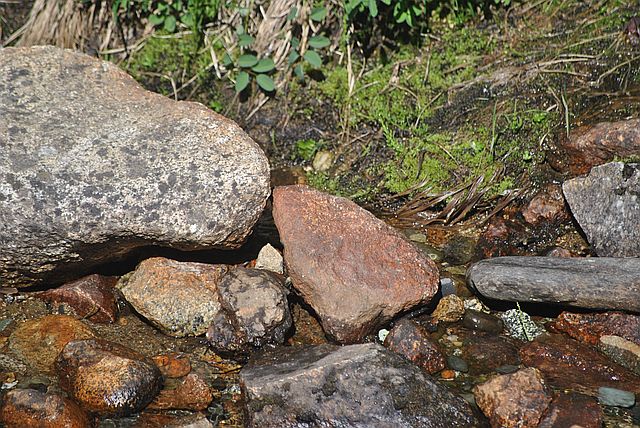 작은 돌들이 철분으로 인해 녹을 가득 머금고 있습니다.