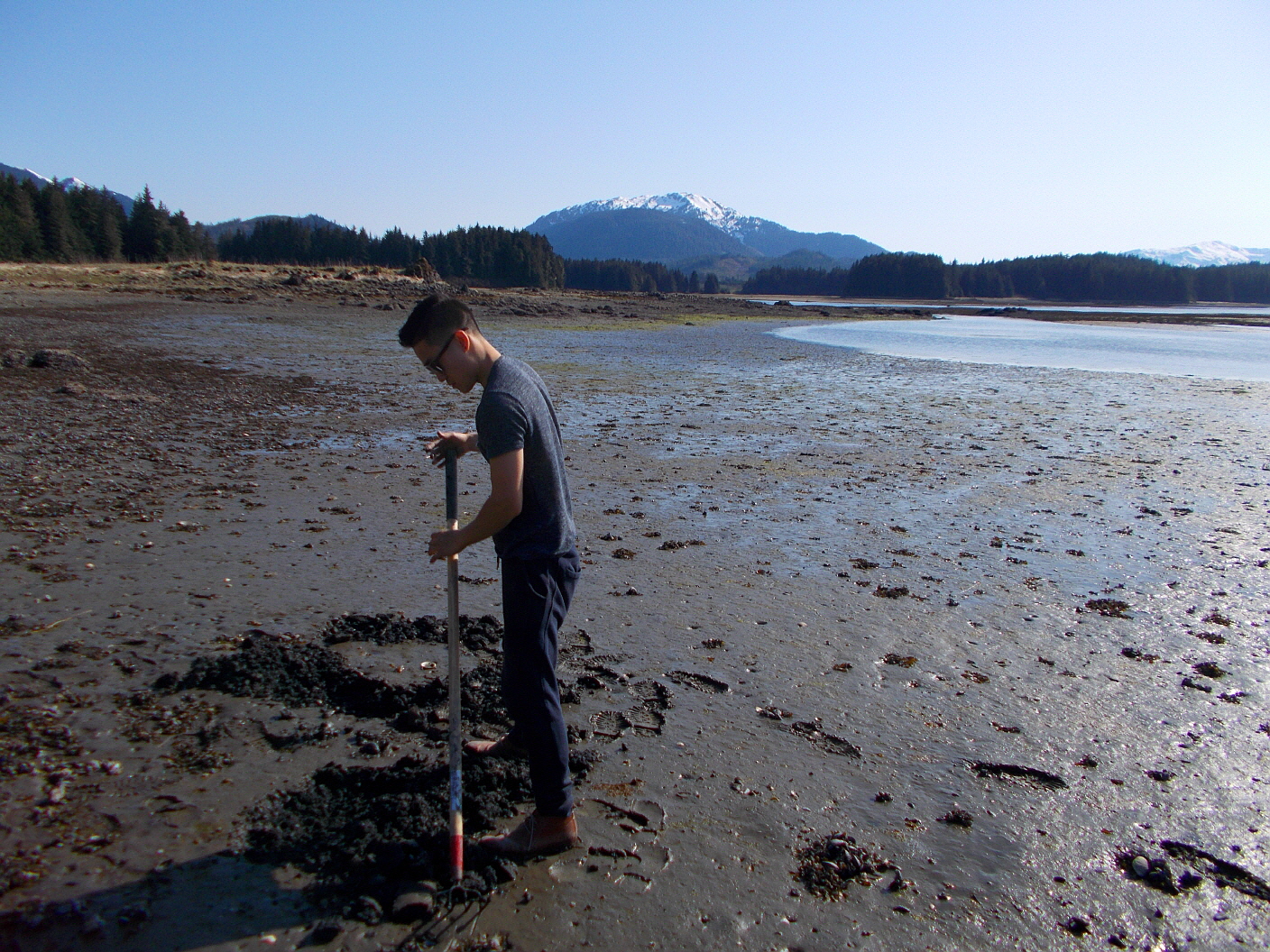 식당 앞 갯벌에서 괭이를 들고 나와 조개를 캐 보았습니다.