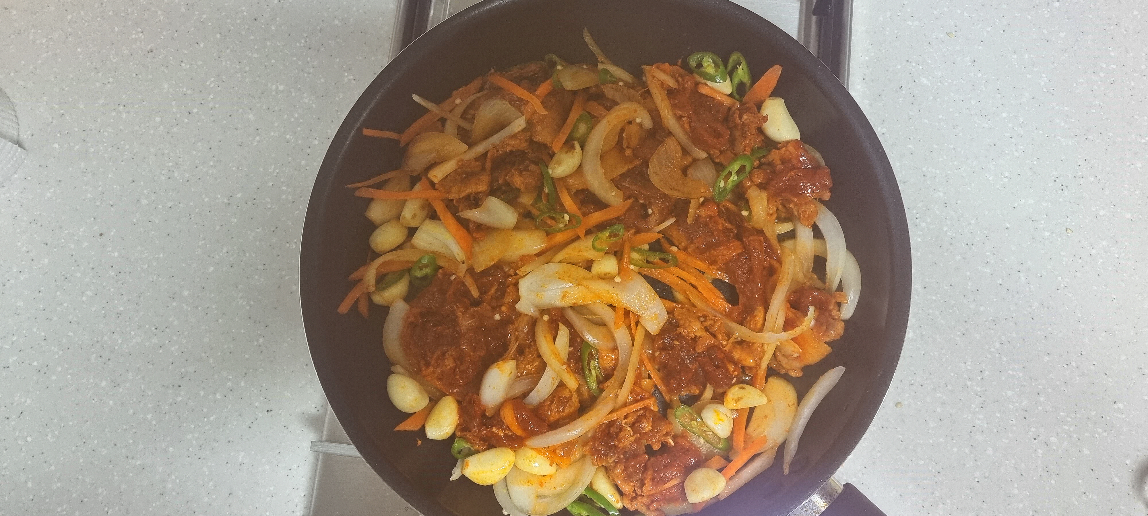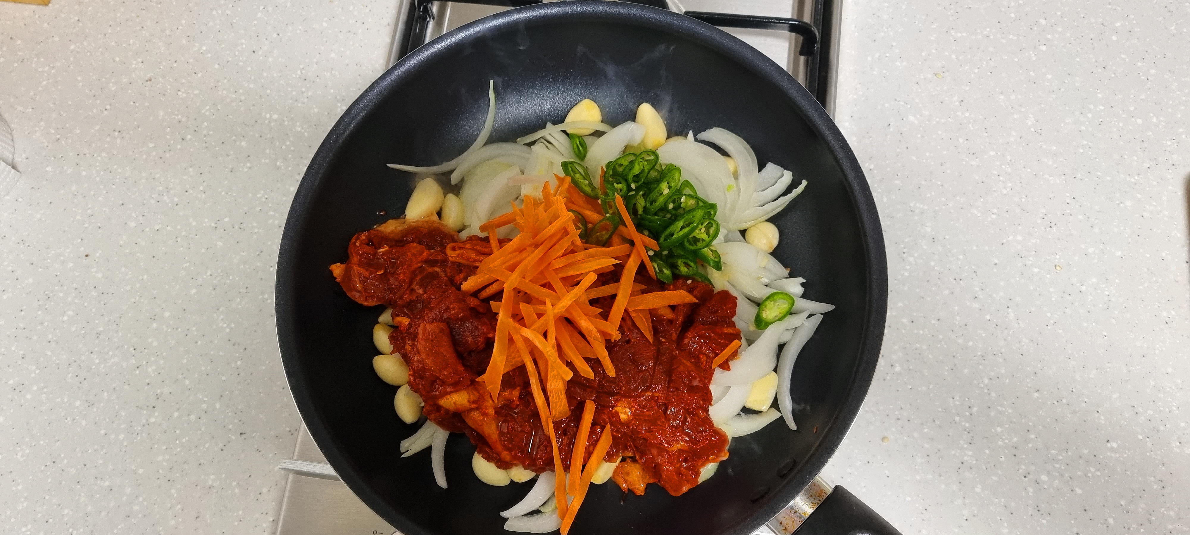 양념에 재워놓은 돼지고기와 함께 마늘, 양파, 고추, 당근을