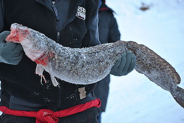 얼음낚시를 즐기는 강태공이 제법 큰 물고기를 잡았네요.