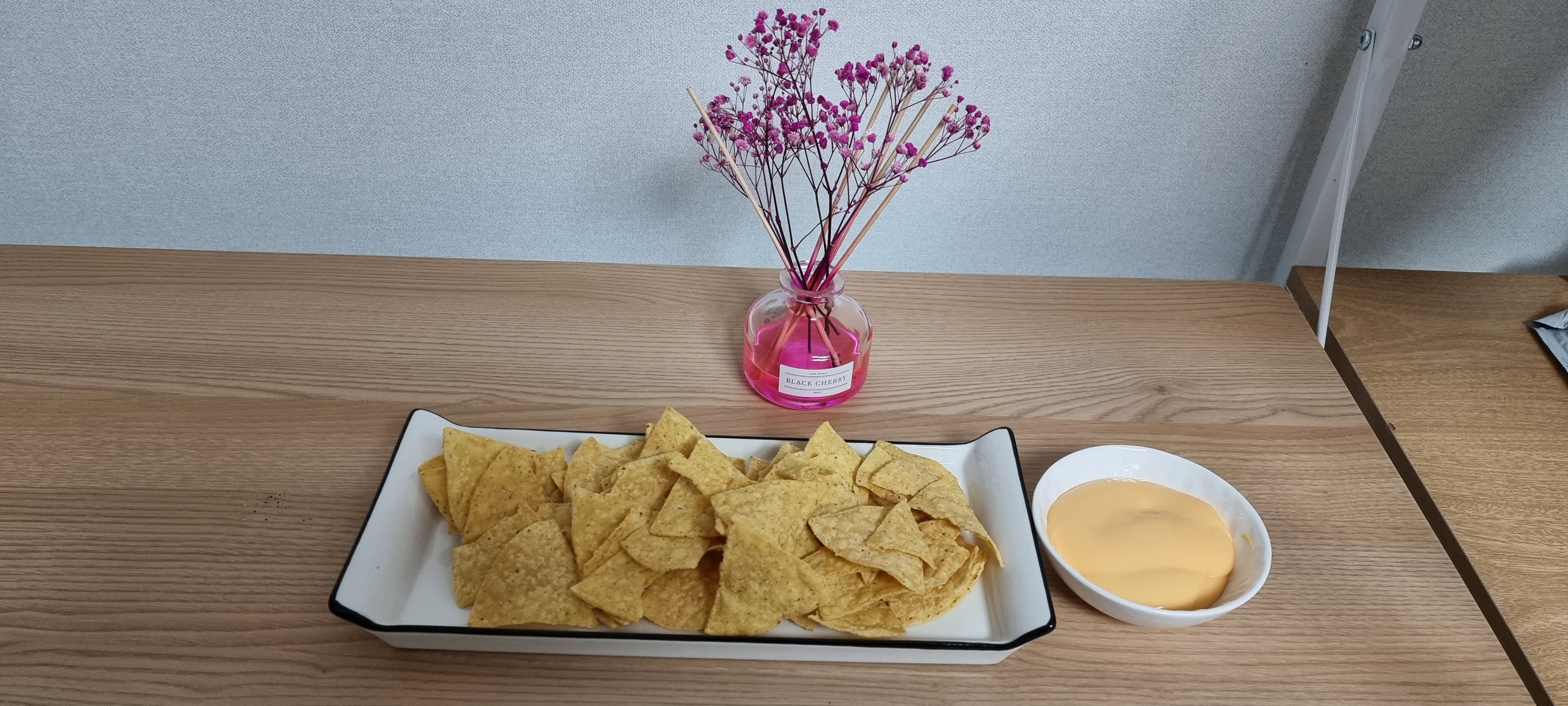 대형 나쵸칩을 사서 체다치즈 소스에 찍어 먹으면