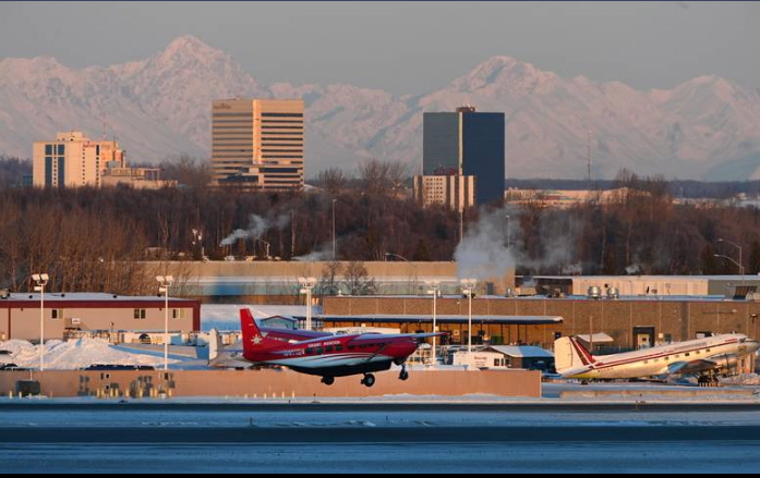 앵커리지 다운타운 경비행장과 추가치 국립공원이 뒤편으로