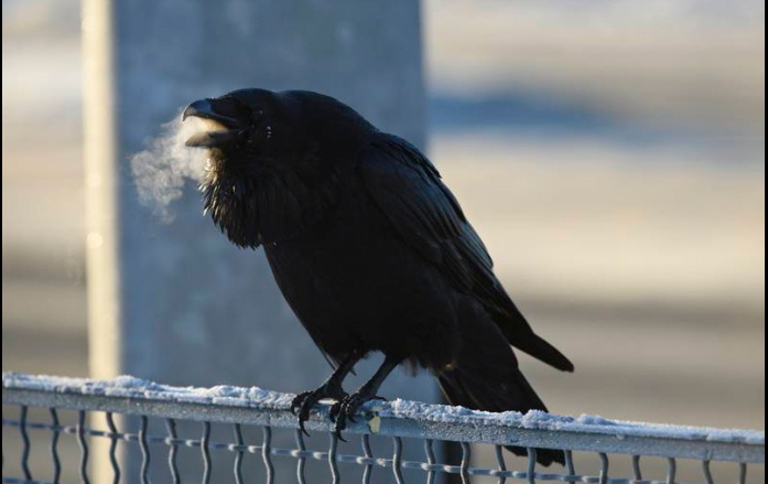 얼마나 추운지 까마귀 입에서도 입김이 나오네요.