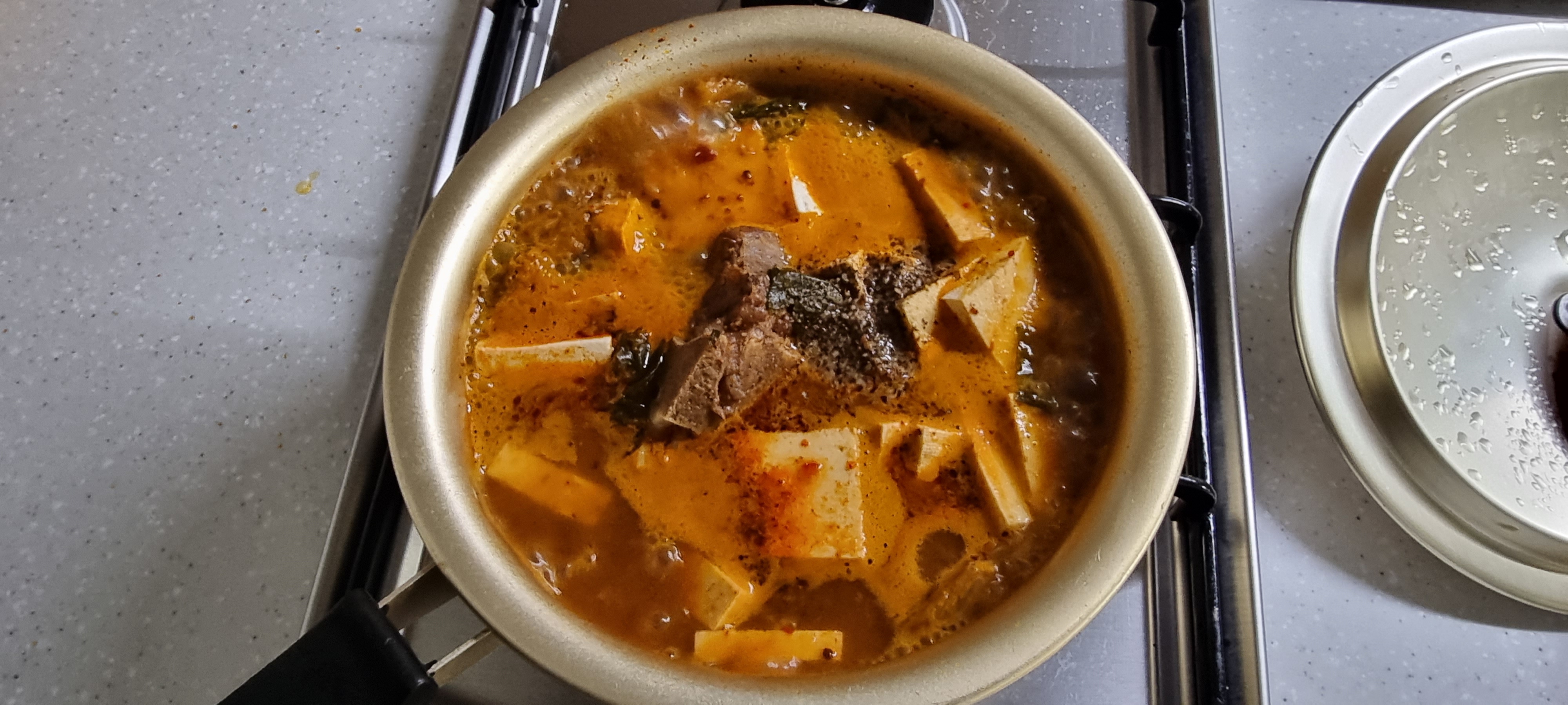 뼈다귀 해장국에 두부를 넣어 끓여 보았습니다.