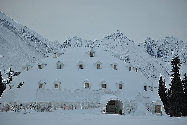 설산 가운데 자리 잡은 이글루 호텔입니다.