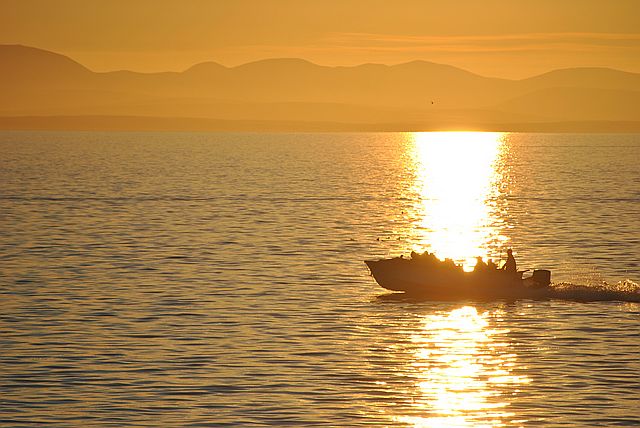 노을이 황금빛으로 빛나는 베링해에서 물개를 잡으러 나가는 어부의 모습이