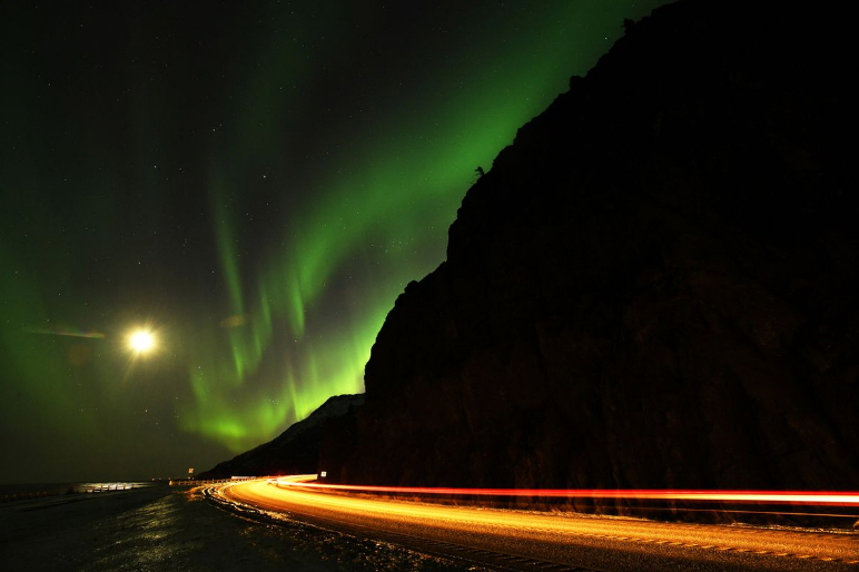 스워드 하이웨이에 뜨는 오로라의 환상적인 장면입니다.