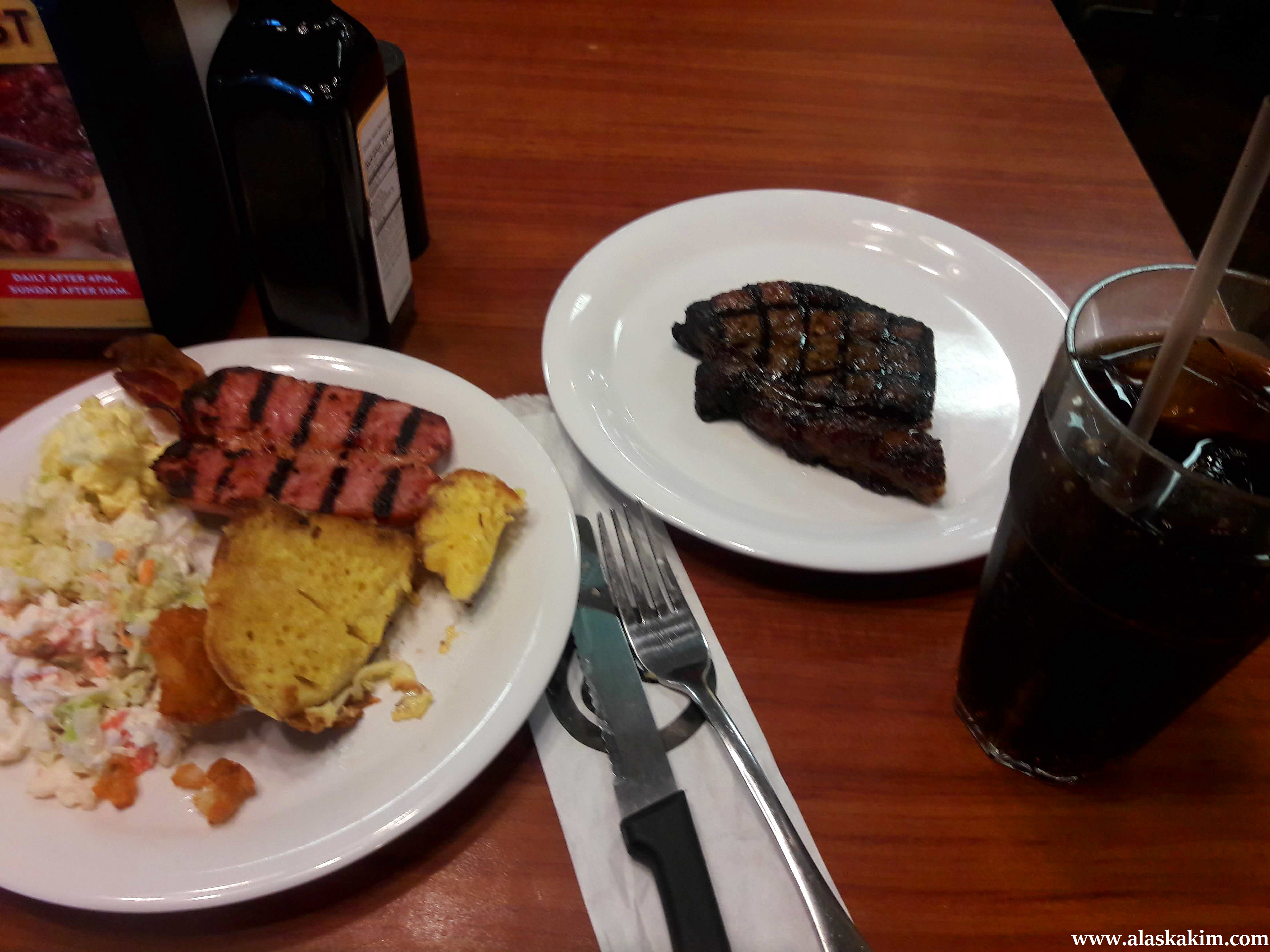 저녁에는 뷔페에 들러 스테이크 한 조각과 샐러드 그리고,