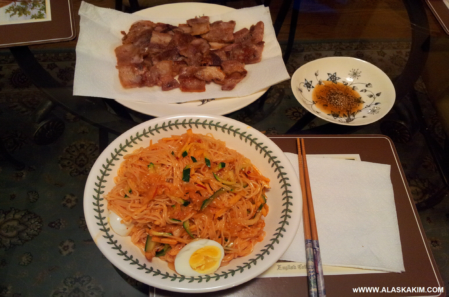 비빔국수에 뱃속이 약간 허전할까 봐 삼겹살을