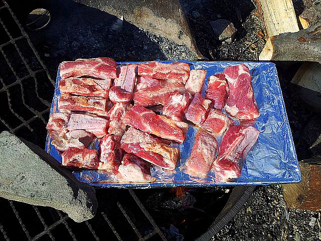 강가에서 장작으로 모닥불을 피워 그 위에 고기를 구워 그야말로