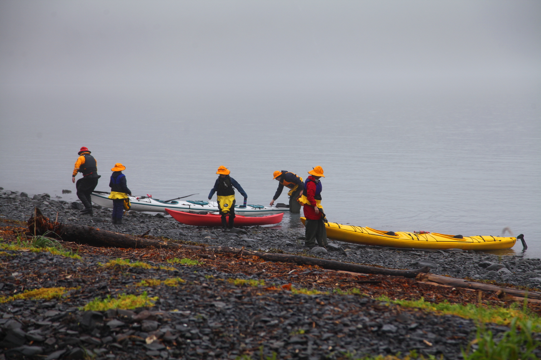 이른 아침부터 카약을 타는 단체 투어객들이