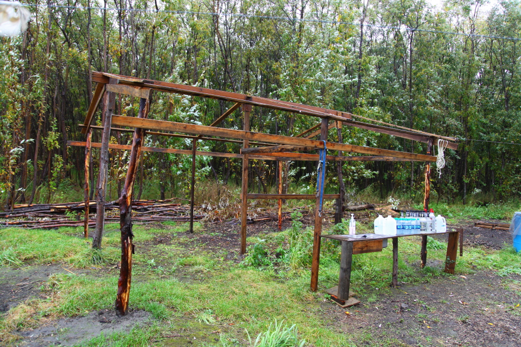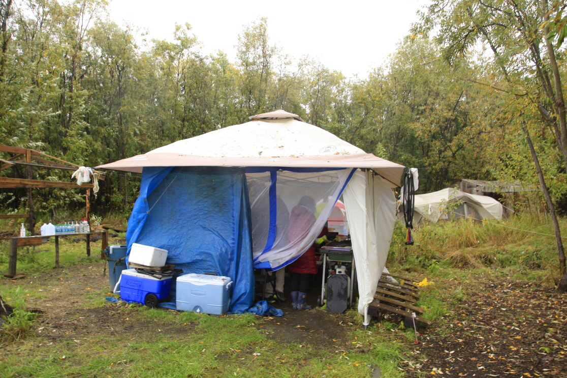 Fish Camp에 자리를 잡고 연어를 손질해 말려서