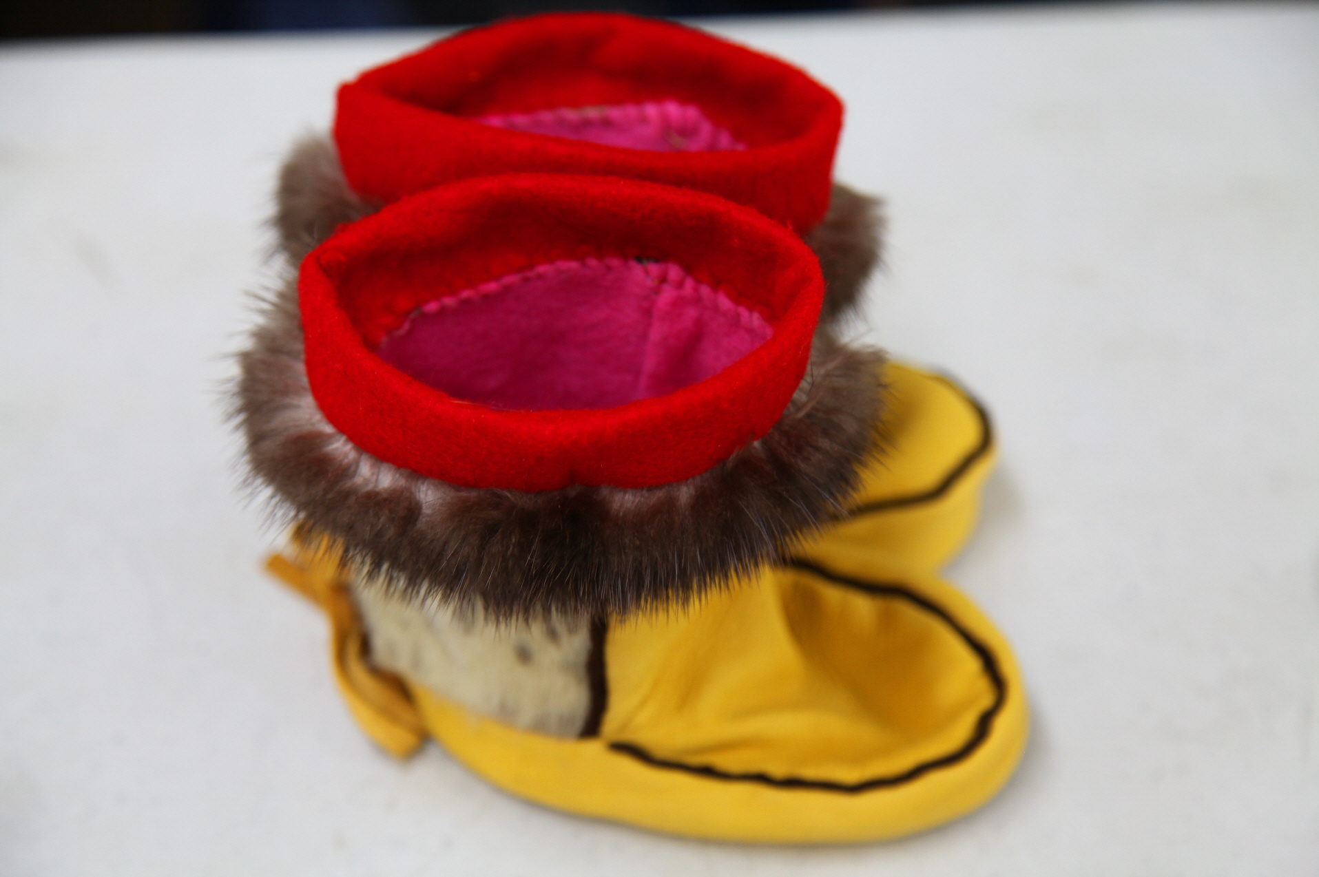 야생동물 가죽과 털로 만든 어린아이 신발입니다.