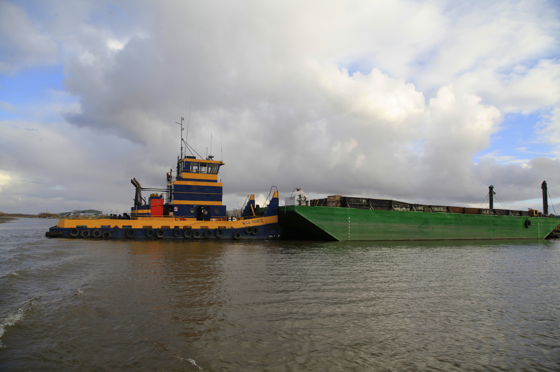 마침, 바지선이 도착해 물건을 하역하고 있네요.