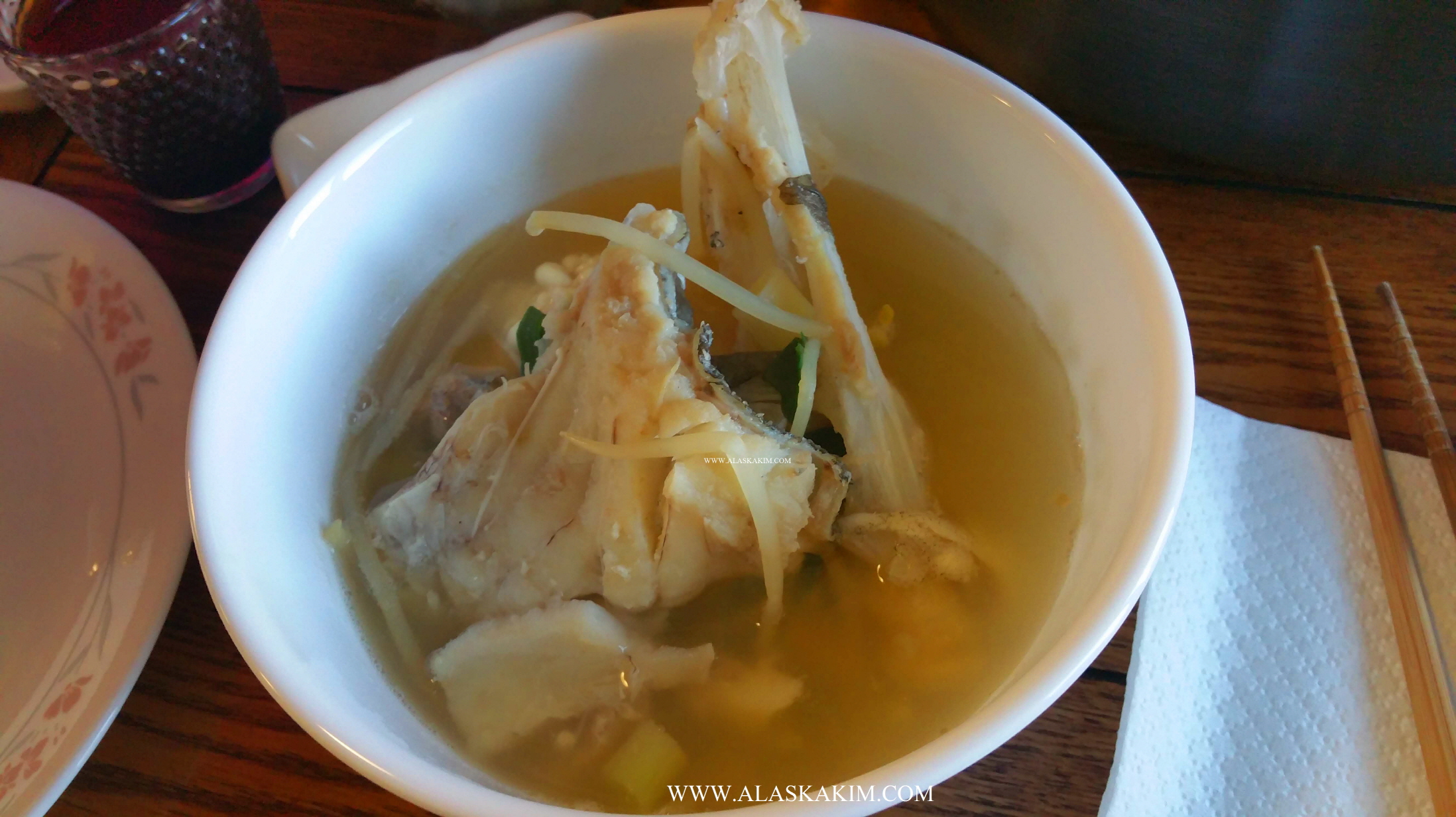 연어회를 떠서 식탁에 올렸으며, 맑은 대구탕과