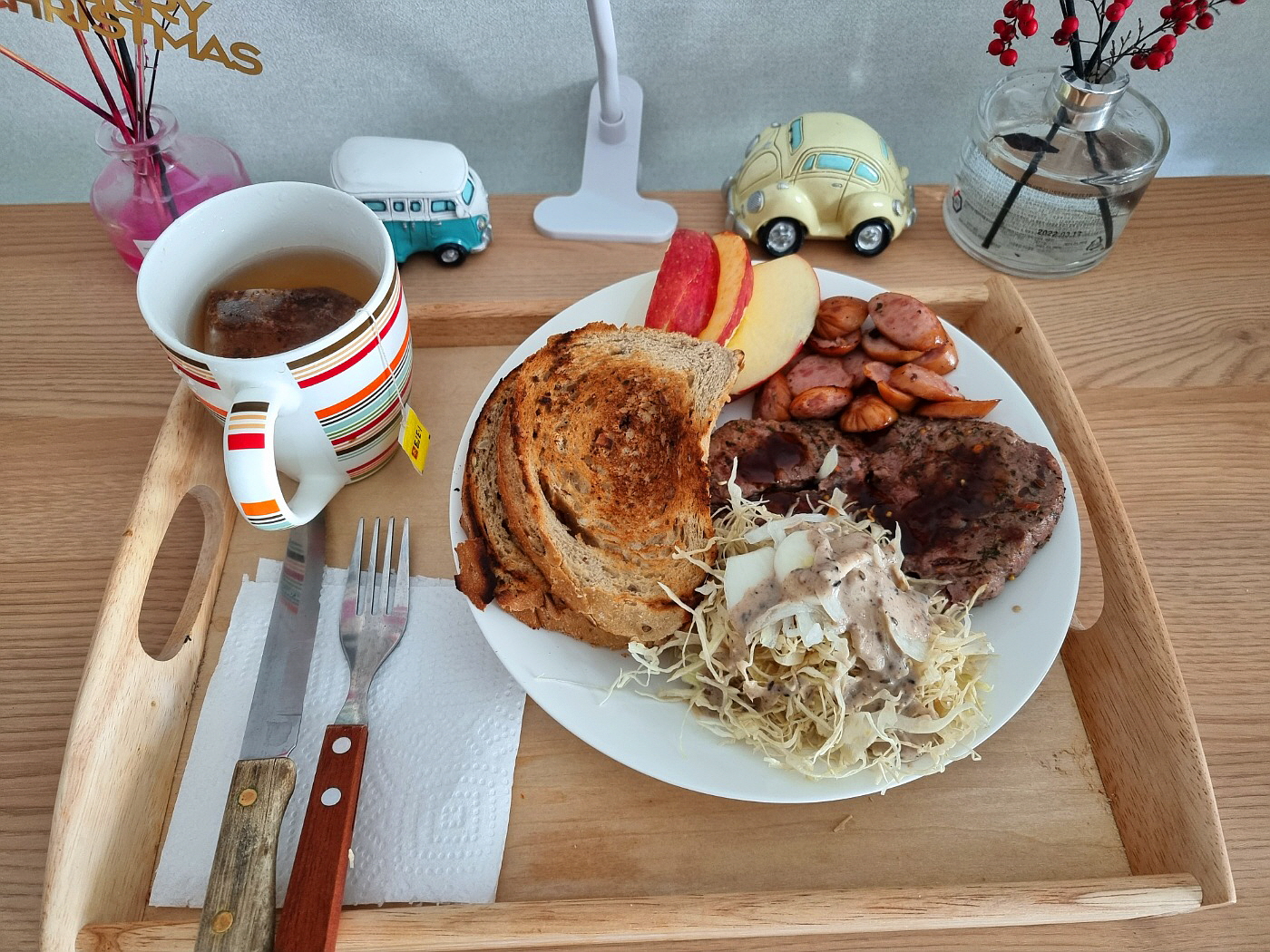 오늘은 둥굴레차와 사과가 자리 잡고 있다.