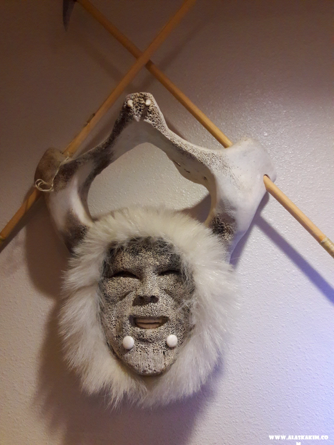 고래의 골반 뼈와 상아, 북극곰의 털로 만든 마스크입니다.
