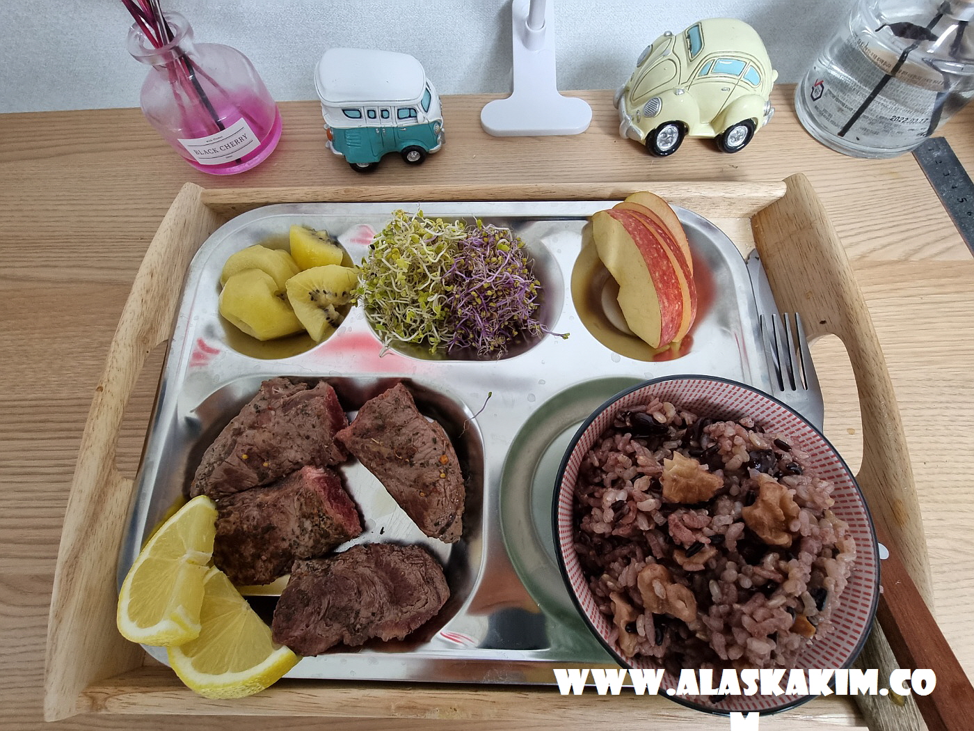 콩, 호두, 현미로 돌솥에 지었으며, 스테이크는 미디엄으로 익혔고