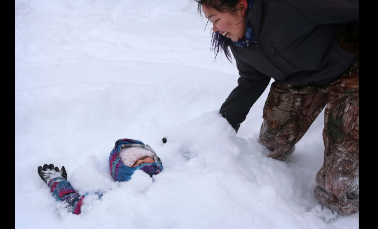 지난겨울, 아이를 눈에 파묻는 엄마의 짓궂은 장난이 모자간의