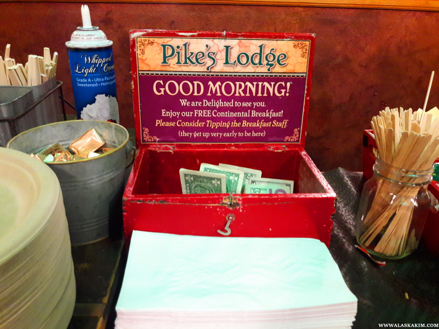 아침 조식을 차리는 직원들을 위해 팁을 내는 이들이