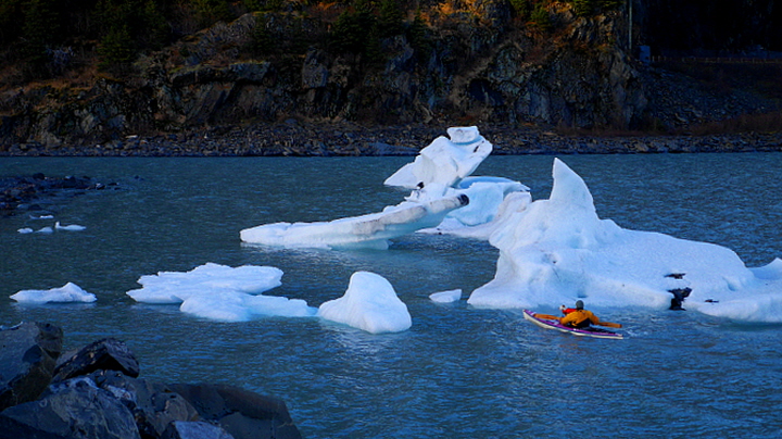 포테이지 호수에 빙하지대에서 흘러나온 유빙의 모습입니다.