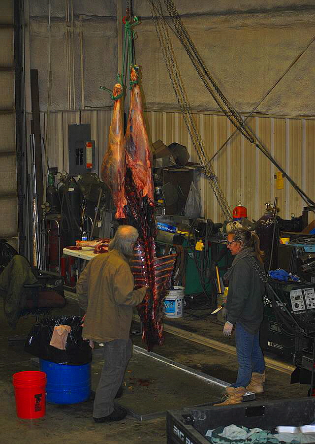 잡자마자 가죽을 벗기고 걸어놓아 피를 뺀