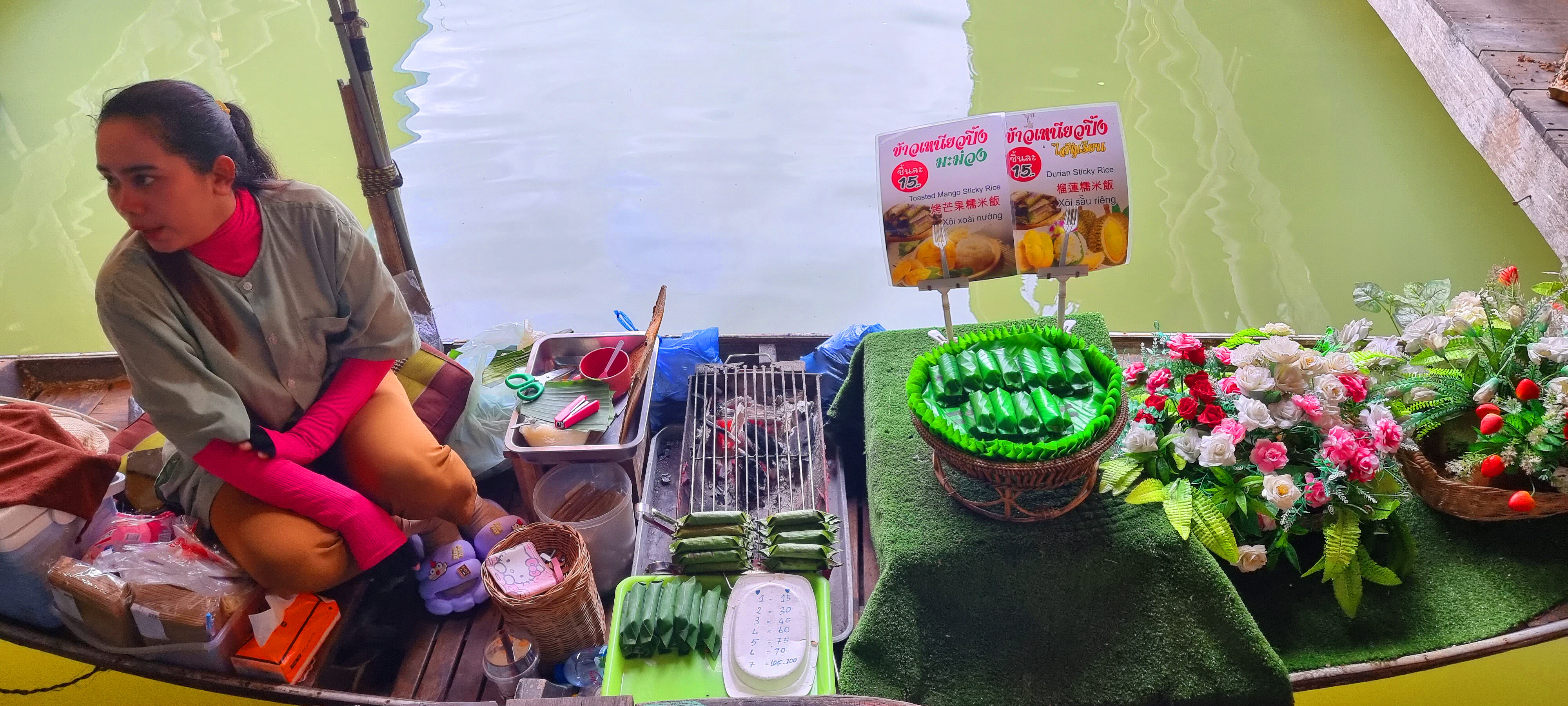 저렇게 쪽배에서 야자수 열매로 싼 밥을 팔고 있네요.
