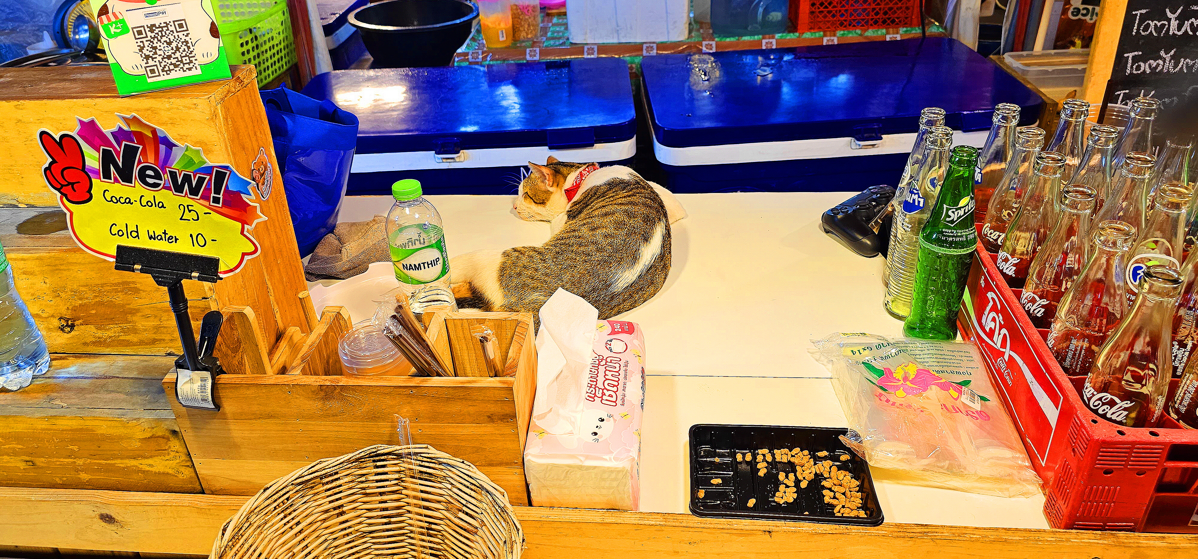 가게 카운터에서 느긋하게 주무시는 냥이.