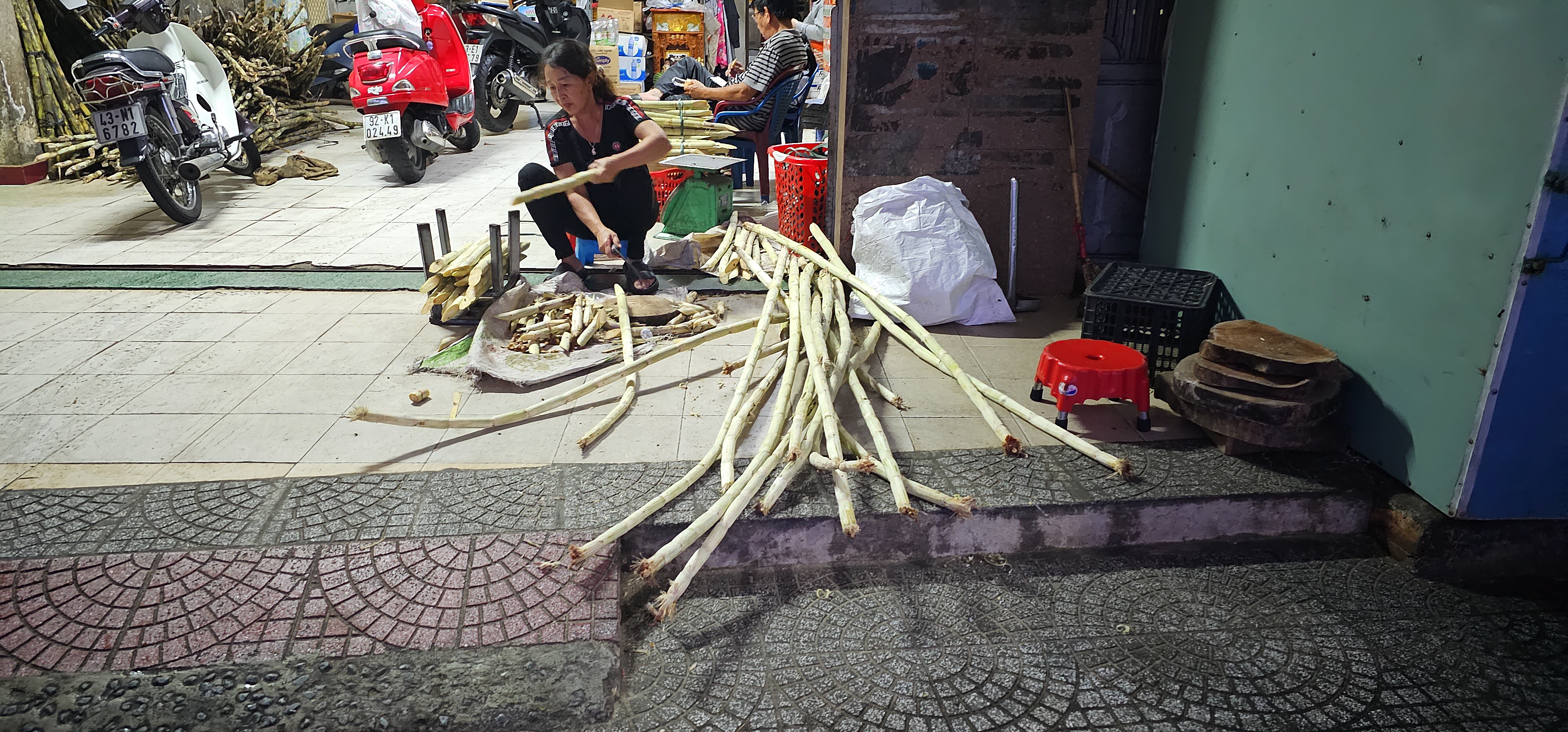 저녁에 장사 나갈 사탕수수를 정리하는 모습인데