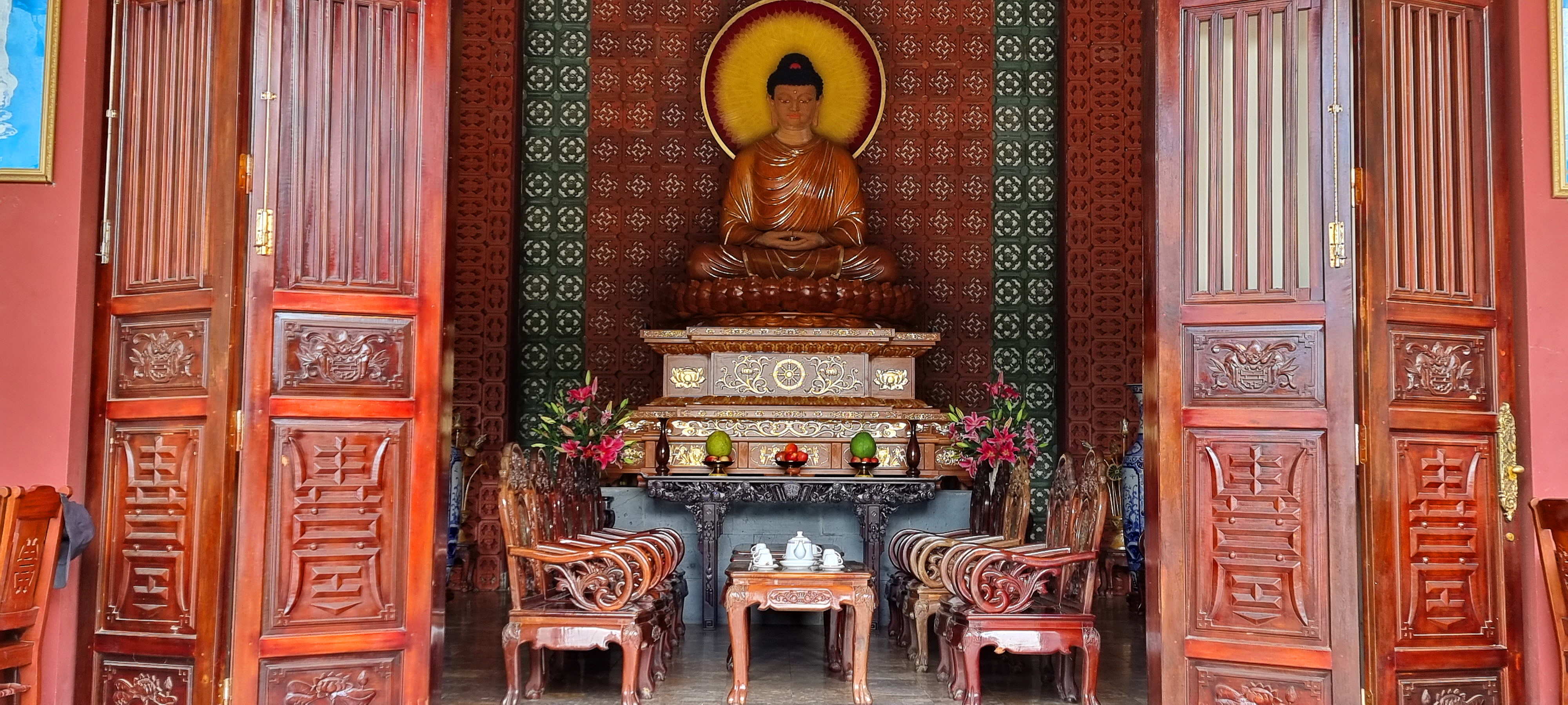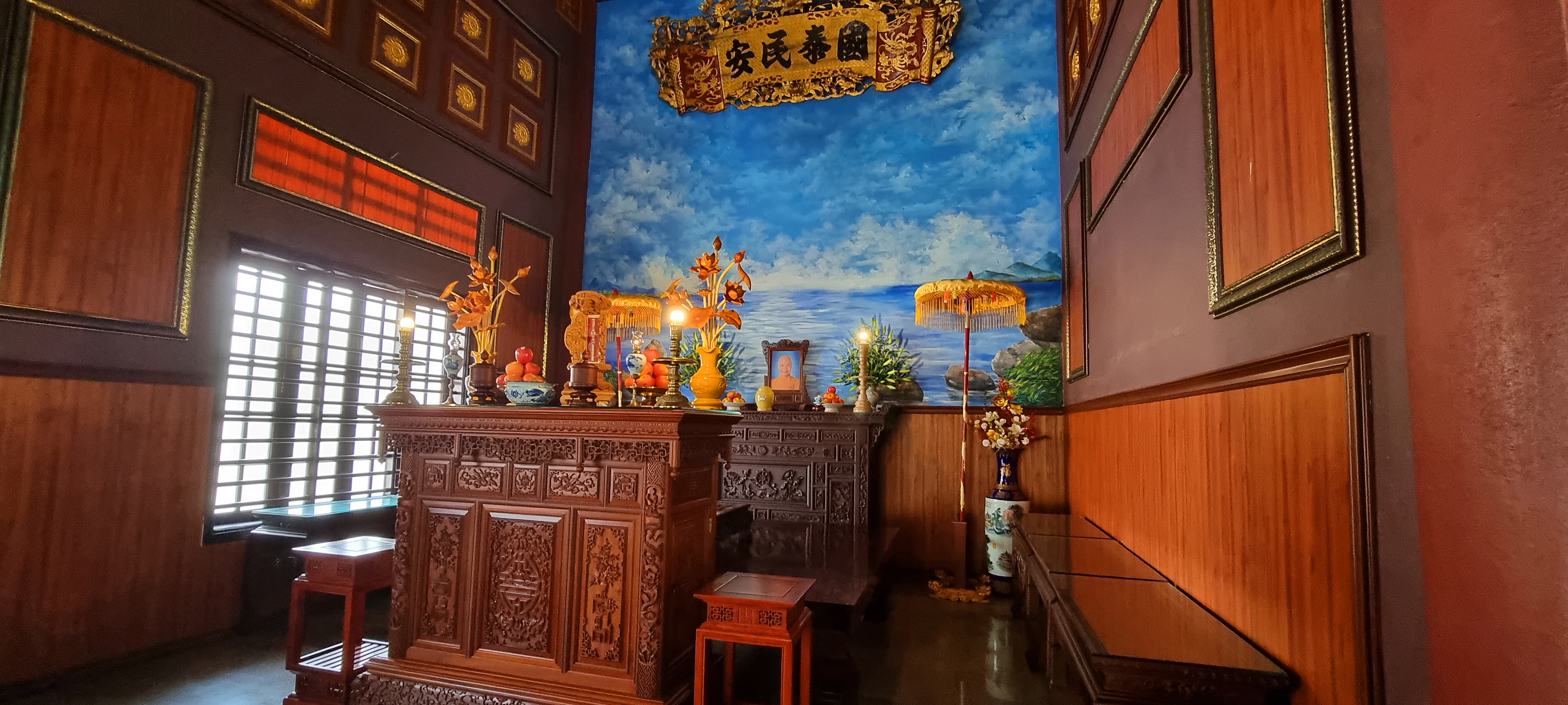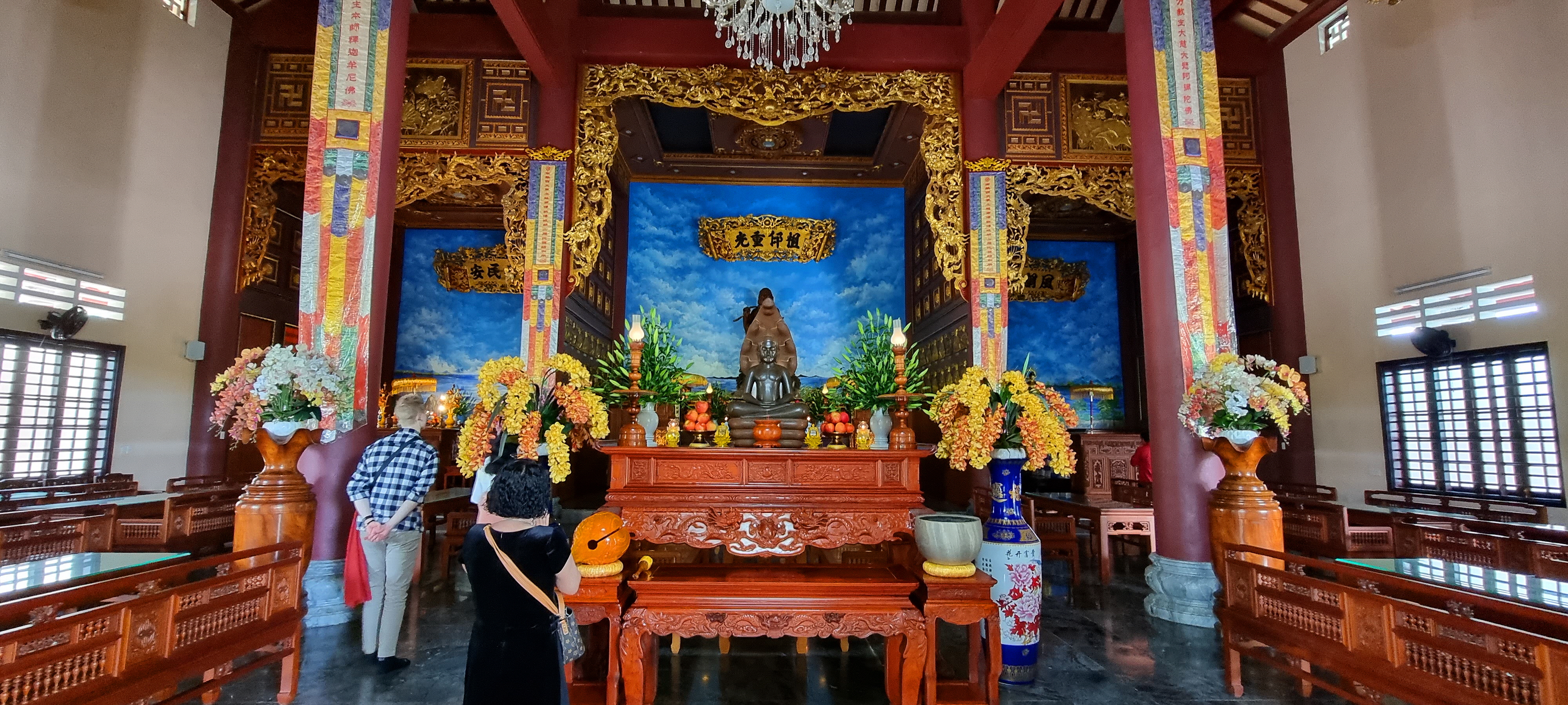 여기 본당은 용 모양의 곡선형 기와지붕으로 덮여 있으며